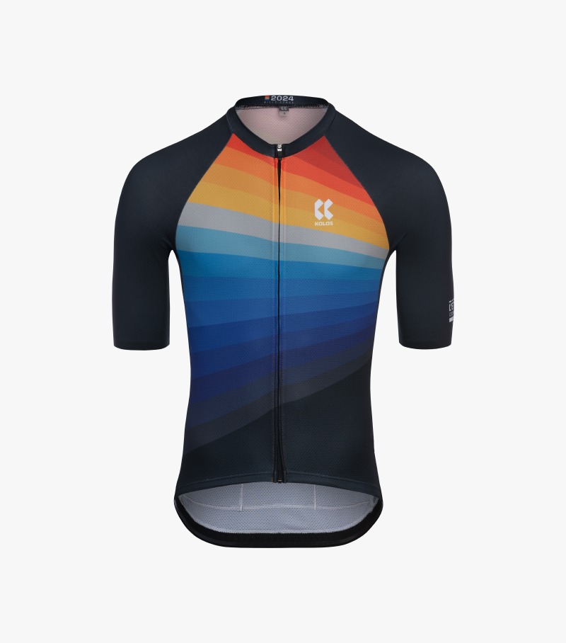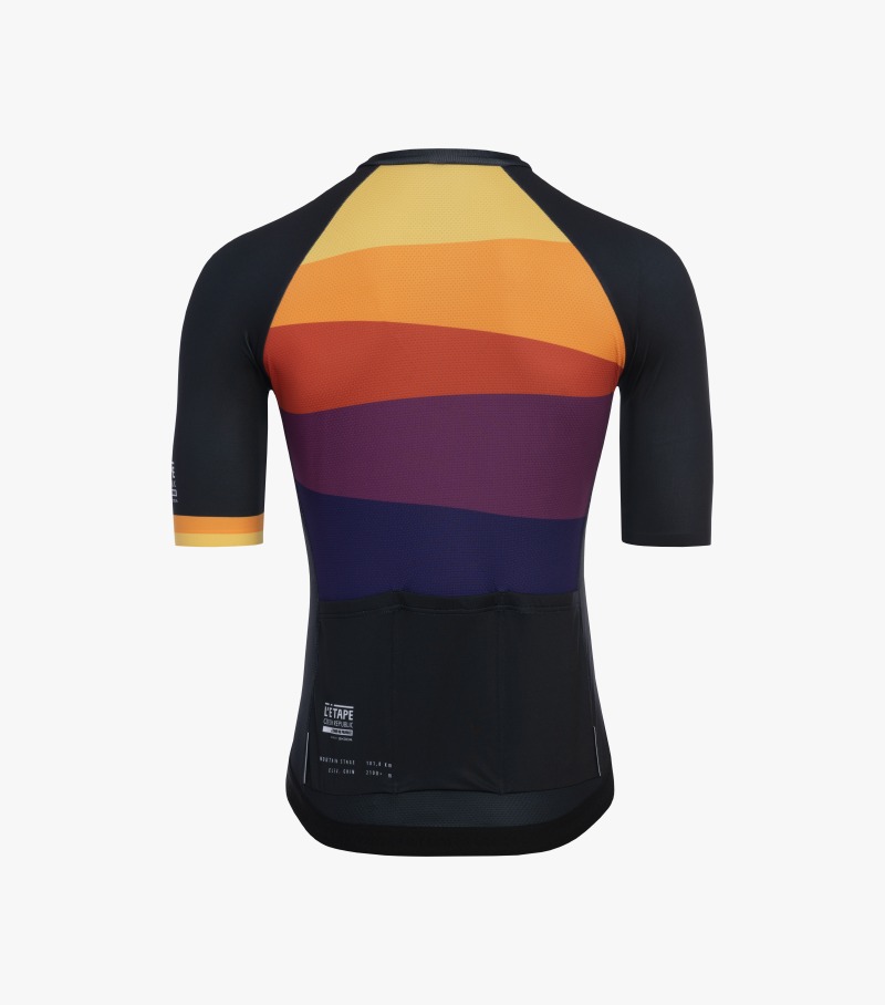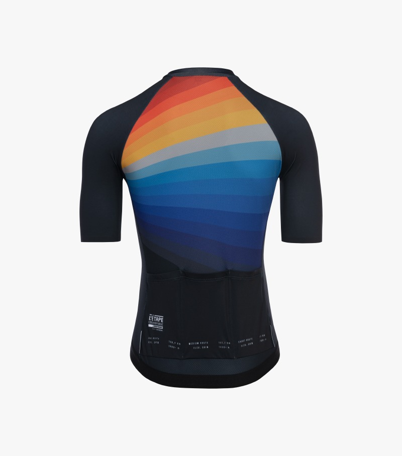 Výjev ikonických ventilačních věží Strahovského tunelu, jehož autorem je vizuální umělec Jan "Kolouch" Šrámek, jsme v pozadí doplnili o spektrum barev východu slunce, což odráží atmosféru sobotního rána při otevření L'Etape vesničky, před tím, než se do areálu začínají hrnout závodníci Dlouhé trasy, která vždy startuje jako první v pořadí. Jedinečnost tohoto okamžiku jsme se rozhodli promítnout do letošního dresu právě formou barevného spektra východu slunce.