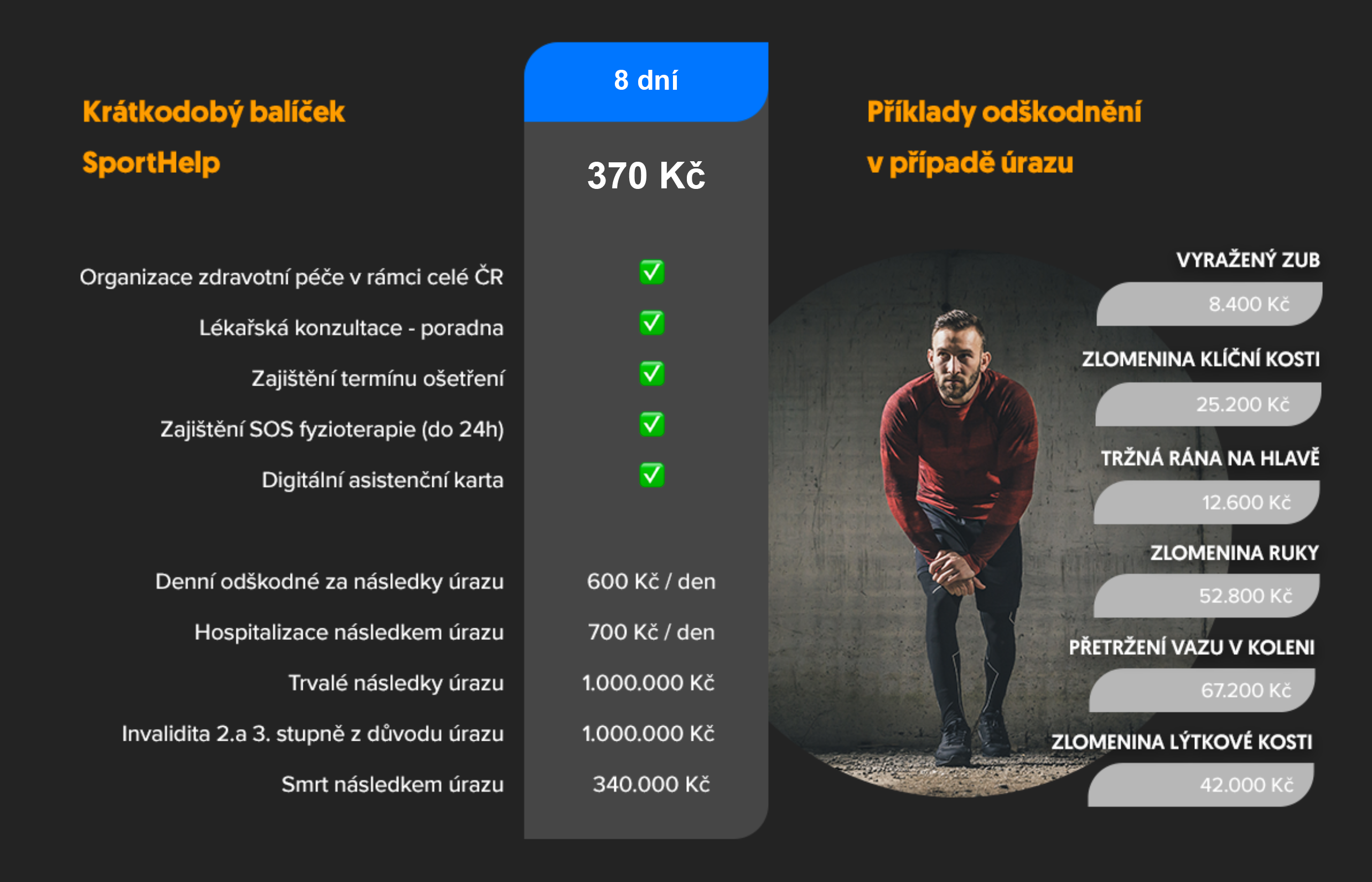 SPORTHELP je komplexní péče pro sportovce zahrnující kromě úrazového pojištění také zdravotní péči a další sportovní benefity. V rámci závodu si můžeš vybrat mezi 3denní a 8denní variantou. Kratší varianta tě vyjde na 290 Kč, delší na 370 Kč. Na obrázcích níže najdeš, co všechno tento produkt obsahuje.