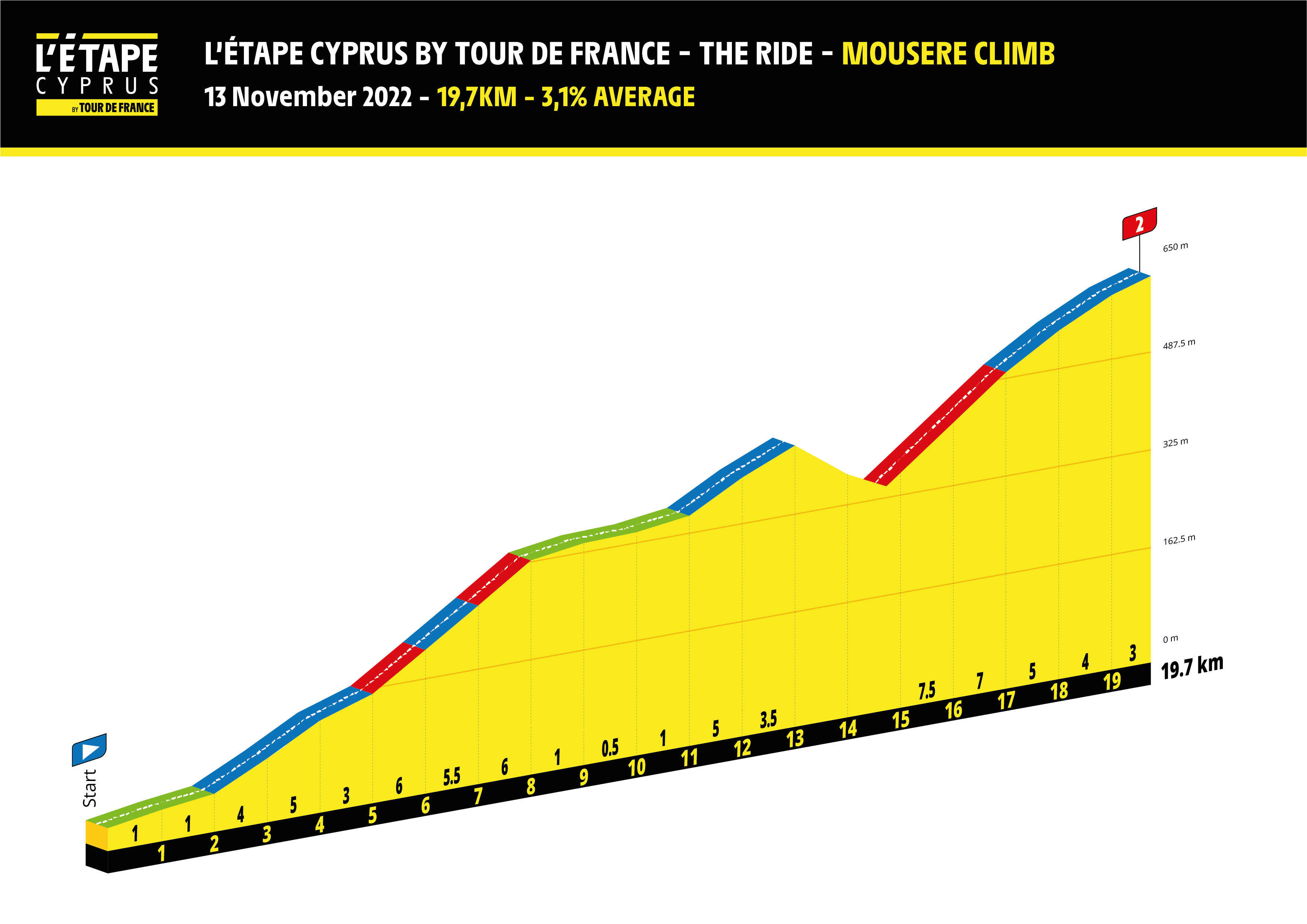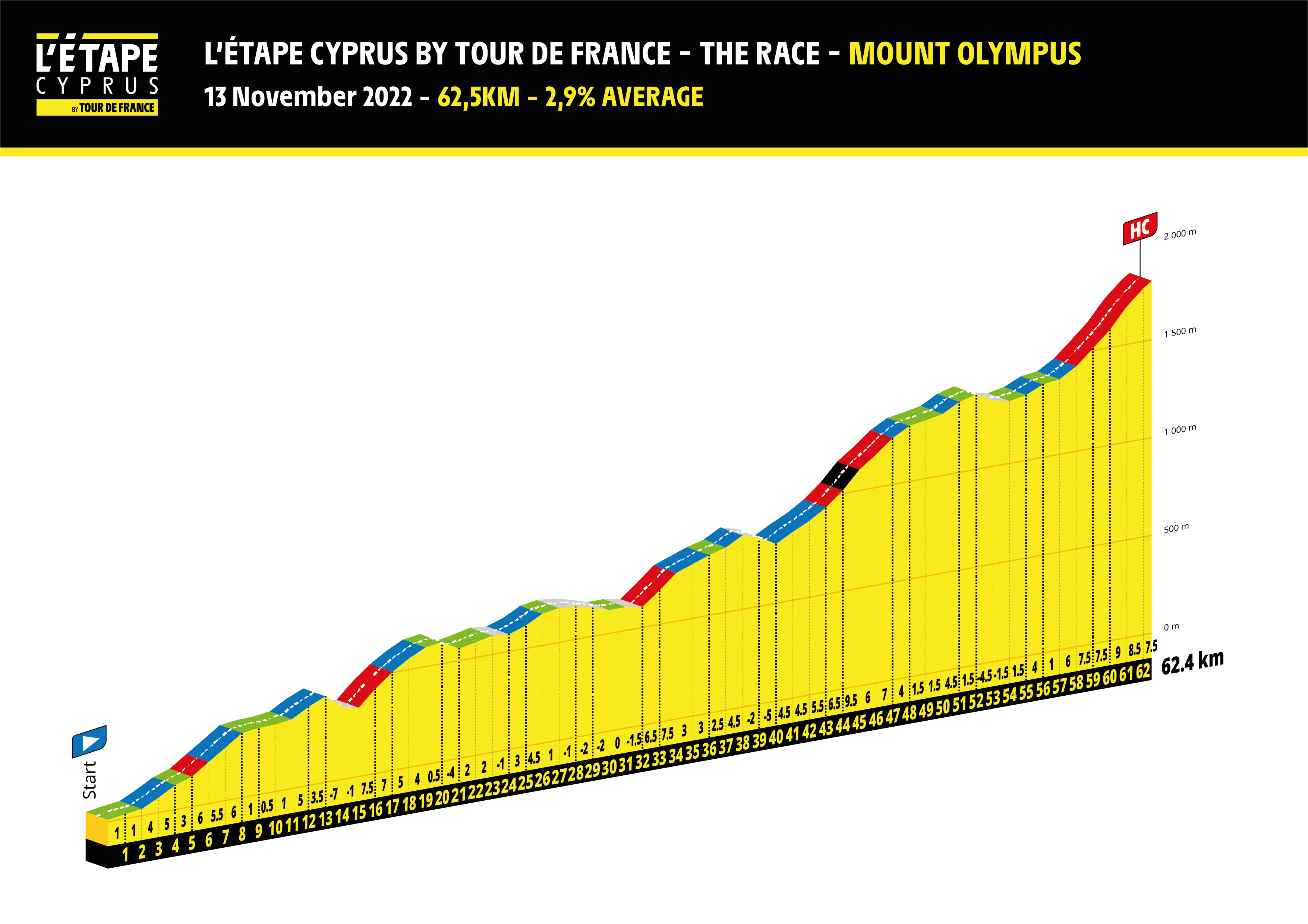 Skutečnou výzvou je dlouhá trasa. Směřuje na ikonický vrchol země v podobě nejvyšší hory Olympus v pohoří Troodos s výškou 1952 metrů. Na cyklisty čeká porce 137 kilometrů s převýšením 3176 metrů. Na krátký sjezd po startu navazuje 62,5 kilometrů, kdy trasa prakticky jen stoupá.